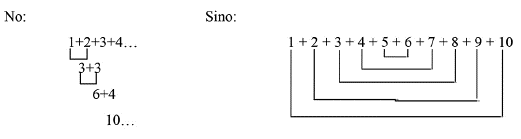 Para facilitar la explicación de la anécdota del pequeño Gauss y del quid del teorema12 que él había descubierto, M. Wertheimer toma la serie 1-10 y nos explica que la expresión gráfica de la resolución de Gauss sería según lo dicho: