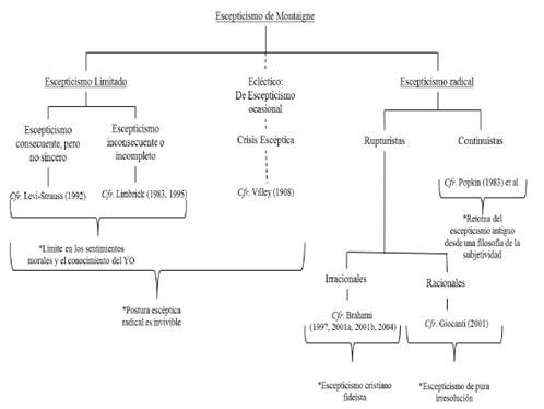 En la siguiente gráfica se resume lo dicho sobre la variación interpretativa acerca del escepticismo de Montaigne.