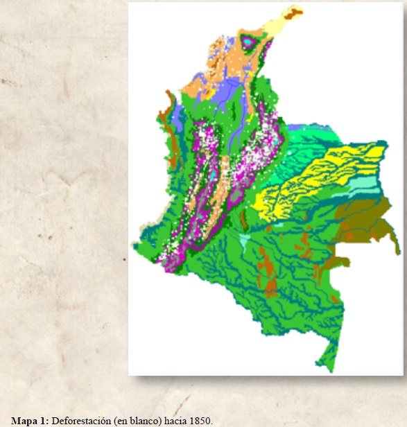 Los siguientes mapas ilustran de manera general el panorama de la deforestación en Colombia, a partir de 1850, cuando la navegación se hace más difícil; son tomados de trabajos previos del autor30 donde se presenta una visión más detallada y en extenso de los procesos de transformación de ecosistemas y sus implicaciones históricas. Los mapas son resultado de una modelación simple a partir de los municipios fundados para la época representada en cada mapa y un área proporcional de deforestación. Deben entenderse ante todo como aproximaciones didácticas para comprender los procesos de transformación, ya que sería extremadamente difícil, si no imposible al menos con los medios actuales, obtener una imagen más realista de la historia de la deforestación del país.