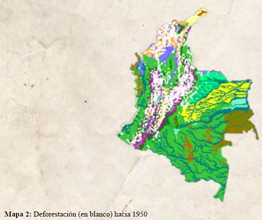 El Mapa 2 muestra la situación probable hacia 1950, cuando el avance de la deforestación, aunque todavía es moderado para el promedio nacional, ya implica una transformación muy grande de las regiones andina y caribe.