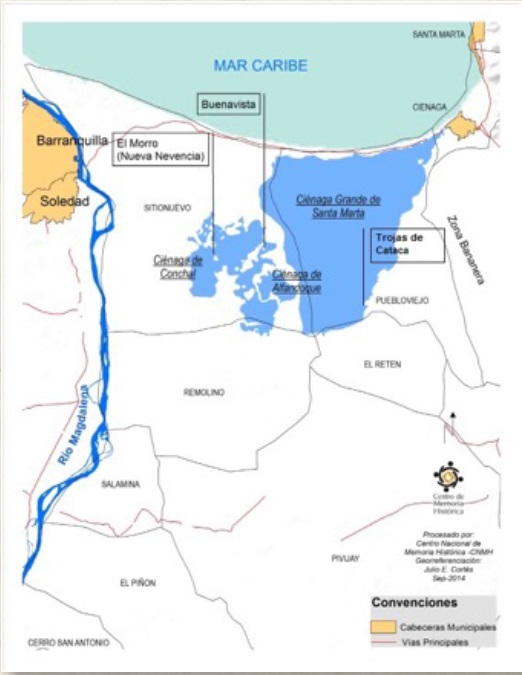El comienzo del plan "romper zona", como lo denominaban los paramilitares del Bloque Norte de las AUC, inició al interior del complejo lagunar de la Ciénaga Grande con la masacre sufrida entre los días 10 y 11 de Febrero del año 2000 en Trojas de Cataca. En ese hecho desafortunado dieron muerte a 7 pescadores aproximadamente, y des-territorializaron a decenas de familias, como lo referencian algunas noticias de prensa e informes de Organizaciones No Gubernamentales3. Esta masacre continuó meses después en los otros dos pueblos palafitos: Buenavista y Nueva Venecia, y tenía dos objetivos definidos: romper los tejidos sociales al interior de las comunidades para borrar las relaciones que estas pudiesen tener con grupos guerrilleros, y el control territorial de la zona para fortalecer el narcotráfico y sus rutas comerciales. En palabras de una testigo de los hechos4:
