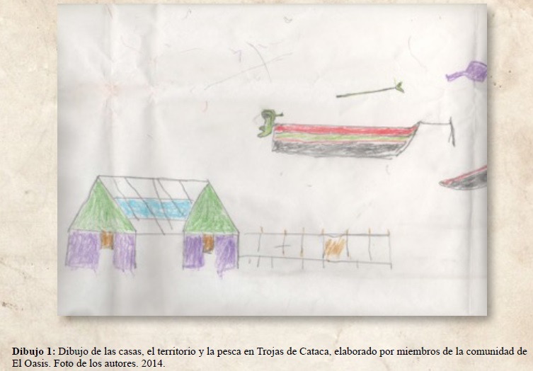 Aquí a lo que llegamos fue pescando como allá (Trojas de Cataca), llegamos y enseguida pescábamos y así, aunque los primeros días era trabajoso porque no estábamos acostumbrados a ranchar, porque allá (Trojas de Cataca) todos los días salíamos a pescar, uno todo los días llegaba al pueblo, en cambio aquí (El Oasis) nos fuimos acostumbrando, primero durábamos un día después dos días, tres días, cuatro días y así nos fuimos haciendo (Entrevista en El Oasis, 2014).
