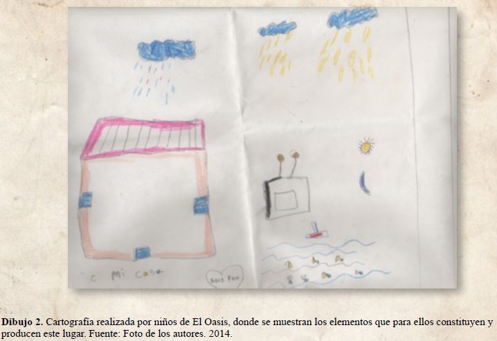 Este hecho deja en evidencia un fenómeno resaltado por Arjun Appadurai (2001). Según este autor las identidades contemporáneas, posnacionales, se construyen desde diferentes frentes, en especial los paisajes mediáticos. En este sentido, la producción de El Oasis dotó de significación una experiencia de re-territorialización que terminó con el emplazamiento. Cuando les pedimos a los niños de la escuela del El Oasis que dibujaran el territorio y las cosas que no podían faltar, el televisor fue un ícono determinante (ver dibujo 2).