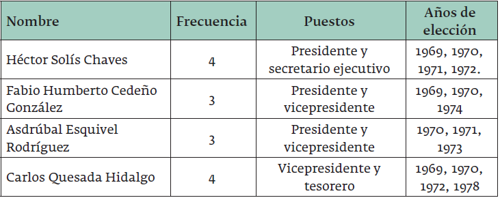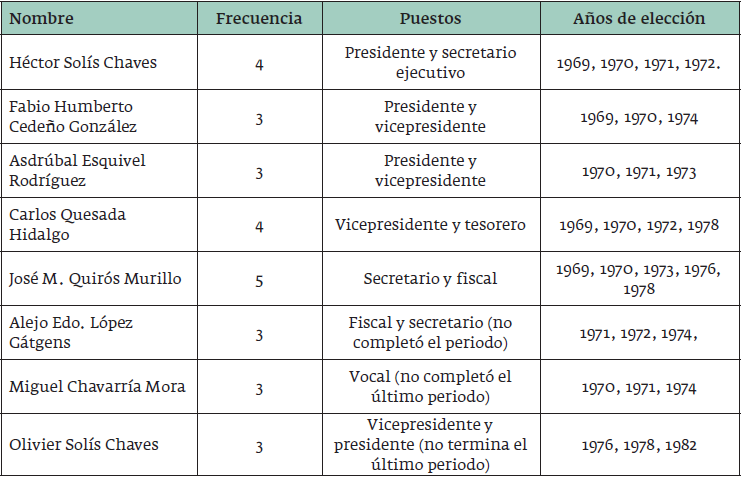 En total, se contabilizaron aproximadamente 83 miembros en las juntas directivas mencionadas, a lo largo de esos veintiún años estudiados. De la totalidad de integrantes, solo cuatro fueron mujeres; era, pues, una forma de sociabilidad fundamentalmente masculina. Y dentro de esa mayoría existieron algunos que destacaron como miembros recurrentes (tabla 1), que formaron parte de la junta directiva en más de tres ocasiones. Según uno de los informantes, esa recurrencia en los puestos de la junta directiva se explica debido a lo siguiente:
