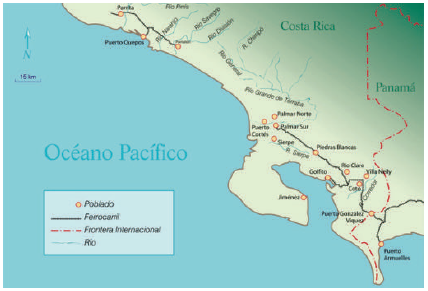 De norte a sur, la UFCo situó sus principales divisiones en Ouepos, Golfito y Puerto González Víquez (Villalobos, 2006, p. 6) (figura 1). Entonces (1930) ya disponía de un capital de 242 millones de dólares americanos, cerca de 1,5 millones de ha de terreno, 80 barcos (la Flota Blanca) y 2500 km de líneas ferroviarias (entre propias y arrendadas), lo que le permitía ejercer un control monopolizado de las exportaciones de Costa Rica, Guatemala y Panamá, al tiempo que copaba el 73 % de las hondureñas (Caldentey y Caldentey, 1993, pp. 145-146; Brungardt, 1995, pp. 107-108).