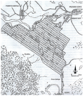 En efecto, el establecimiento de una plantación de banano implicaba tala de bosque y preparación del terreno. En invierno había que desalojar el agua sobrante, para lo cual se cavaban zanjas y canales de desagüe. Por el contrario, durante el verano (estación seca) la planta demandaba agua, por lo que también era preciso instalar una compleja instalación de riego (cf. Ellis, 1983, p. 85; Villalobos, 2006, pp. 8-9). En Palmar Sur la red hidráulica conectaba con el estero Azul (afluente del río Sierpe) y se apoyaba en varias estaciones de bombeo (Baudez et al., 1993) (figura 4).