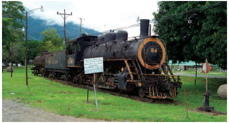 Más allá de estas formas y medios de transporte, la UFCo consiguió hacer de Palmar Sur un negocio rentable gracias a sus ferrocarriles -que dieron acceso a amplias extensiones de terreno cultivable (Goluboay y Vega, 1988, p. 132)- y muelles. Las obras del tren comenzaron a finales de la década de 1930. La línea principal comunicaba Golfito con Palmar Sur y con Puerto González Víquez. Estos trenes, arrastrados inicialmente por máquinas de vapor (figura 6) -más tarde, diésel-, recorrían los ramales de las fincas hasta las empacadoras, donde cargaban la fruta y la transportaban hasta el muelle. También prestaban servicio a pasajeros y contribuían al abastecimiento de la comunidad local (Villalobos, 2006, pp. 15-16; Stephens, 2008, pp. 639-640; Zamora, 2012, p. 35).