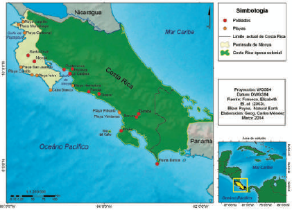 En las costas de Nicoya en Costa Rica, el uso de conchas y caracoles por parte de los indígenas fue muy antiguo. En un estudio de Maritza Gutiérrez sobre el sitio Nacascolo, en el actual Guanacaste, se encontró que en los concheros se hallaban unas 40 especies de moluscos en un periodo que va desde el 300 al 1350 d.C. Más en concreto, acerca de nuestro estudio, la investigación encontró la Vitularia salebrosa (King y Broderip, 1832), de la familia tintórea Muricidae (Gutiérrez, 1993, p. 12). De manera que en Costa Rica consta que la extracción del tinte se llevó a cabo desde la época precolombina hasta el presente en los pueblos costeros, en pequeñas islas e isletas y sitios cercanos al litoral Pacífico, como Boruca, Quepo y Nicoya (mapa 1).