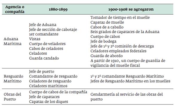 En la vida cotidiana esto generó prácticas entre quienes sabían hacer bien las cosas para evitar dar señales sospechosas y quienes no tenían mucha experiencia. Este era el caso de cualquier jornalero, ya fuera porque un jefe de cuadrilla lo hubiera integrado solo por ese día ante la falta de manos en una labor nueva para él, o bien lo subcontratara como parte de otra cuadrilla, fuera un recién llegado o estuvieran sustituyendo a otro trabajador (aunque le pagaran menos). Estos trabajadores eran más vulnerables si las cosas salían mal y acababan en el juzgado, porque para el jornalero era importante explicar su posición, la hora y la actividad que estaba desempeñando en ese momento. Ante los cambios en las dinámicas laborales en el diario acontecer, varios casos muestran que la sistematización de funciones en el desembarque de los vapores estaba cambiando. Asimismo, las formas en las que los trabajadores se relacionaban entre sí y con los vigilantes transformaron las viejas prácticas laborales que normaban el trabajo colectivo. Por una parte, dichas prácticas, como, por ejemplo, hacer negocios por su cuenta, o conseguir emplearse por un día cuando no se tenía una red de conocidos entre los jefes de cuadrilla, era cada vez más complicado. Por otra, con la intensificación de actividad en cada sitio, la jerarquía de vigilancia se hizo más compleja y se requirió más control. En la tabla 1 se pueden apreciar los puestos que se agregaron a partir de 1900.