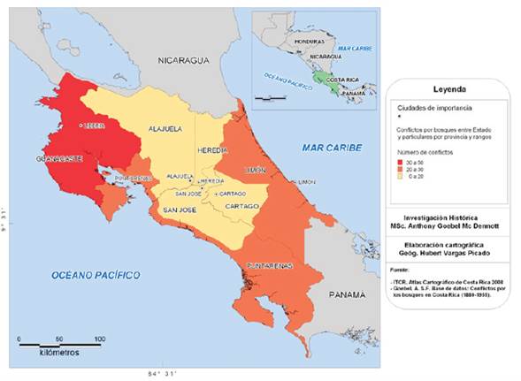 Como se mencionó con anterioridad y a partir de nuestro intento de construcción tipológica de los conflictos en torno a los bosques costarricenses, desde la perspectiva de sus actores el tipo dominante en los conflictos por su explotación económica es aquel que enfrenta a particulares y al Estado con intereses contrapuestos, pero con la misma concepción utilitaria y económica de los bosques. Las disputas, vale señalar, tuvieron lugar, sobre todo, en las provincias costeras: Guanacaste, Puntarenas y Limón, en las que se ubicaban la mayor parte de los bosques de los que se extraían productos forestales de alto valor comercial, tales como el hule y las "maderas preciosas" (véase la figura 1).