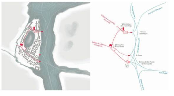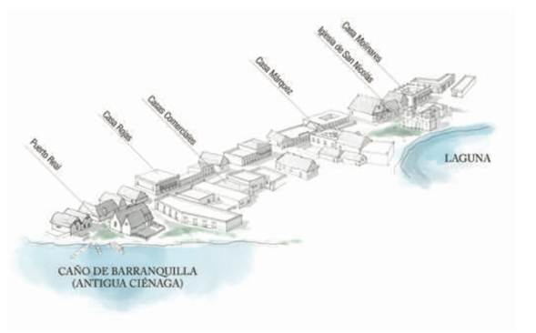 El patrón funcional de dicho embrión de ciudad consiste en la intercomunicación de tres barrancas o embarcaderos primitivos a través de tres vectores principales, predefinidos y enmarcados por hechos naturales o accidentes geográficos: escorrentías, arroyos, quebradas, lagunas y pantanos, conformando un terreno supremamente hostil para el establecimiento de una población primitiva. Los embarcaderos de La Barranquilla, de San Nicolás y de El Puerto, estaban interconectados por las sendas que serían posteriormente las calles Real, de la Iglesia (Progreso) y del Comercio2 (Vergara y Baena,1922).
