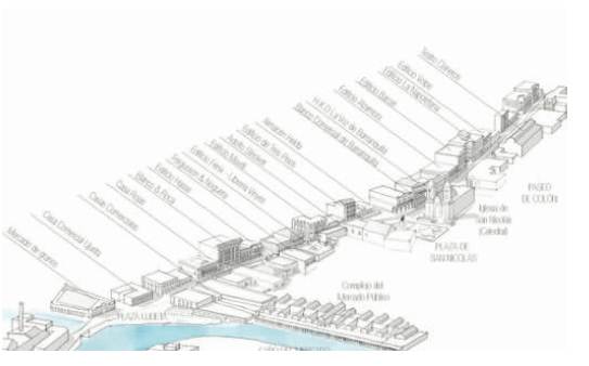 El primer ensayo de calle moderna aparece entre 1870 y 1878, al fusionarse las arquitecturas de los cobertizos de talleres y fábricas incipientes, y el edificio del mercado público, formando un tándem capaz de concretar las características que tendría formal y funcionalmente la calle comercial. Su primera probeta fue el callejón del Progreso, regándose en los años posteriores de forma más definida en las calles adyacentes a esta, como la calle del Comercio o la calle Ancha. Esta forma de calle comercial del siglo XIX fue el primer germen de la calle de comercios nucleados y redes de comercios minoristas que caracterizaron la calle comercial del siglo XX y que se mantuvo vigente, podría afirmarse, sin muchas alteraciones, hasta la década de los noventa.