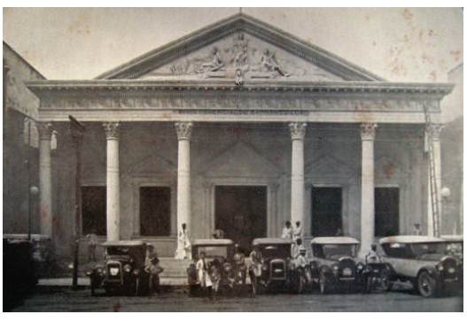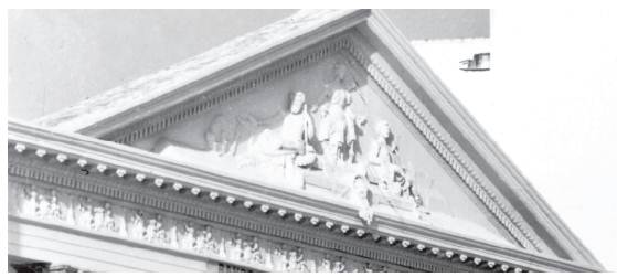 Hoy día la permanencia del bajorrelieve en el frontón ofrece una de las pistas más contundentes sobre la ciudad de entonces: en la Barranquilla de 1904 ya se había llegado a un consenso en cuanto los elementos que hacían de la ciudad el emporio de riqueza y prosperidad que su clase dirigente pretendía expresar. A la izquierda, aparece Éfeso, el dios herrero de la Grecia clásica, con la representación iconográfica típica del neoclasicismo europeo, que lo muestra luciendo una barba, un martillo en su mano derecha, apoyado sobre un yunque. En el frontón aparece también la forja de Éfeso (encargado de fabricar las armas de los dioses); entronizada en el centro está la diosa de la fortuna, que se identifica por la cornucopia a sus pies de la que brota la fertilidad y la abundancia, hasta salirse derramándose sobre la carrera del Progreso. A la derecha aparece Hermes, el mensajero de los dioses: sus botas aladas están efectivamente ocultas en la parte inferior de su figura; el bastón de mando o vara mágica de Hermes, portador de las dos serpientes entrecruzadas, está sostenido por su mano izquierda, un elemento delicado que con el pasar de años y lluvias debió haberse desmoronado. Colgando al final del bastón de mando aparece el petaso: el sombrero de viajero alado; está tan inidentificable hoy en día que pareciera flotar en el espacio.