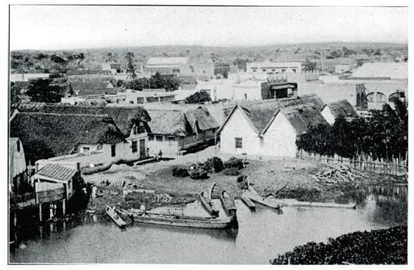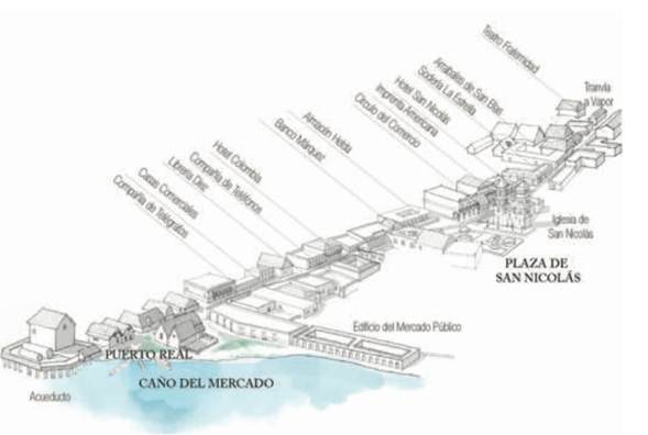 Con la tierra que se extrajo de la ciénaga a la manera que se hizo al final de la calle de San Juan formando el malecón, se extendió con el uso de la misma máquina, un terraplén a lo largo de la orilla de la ciénaga, hasta llegar al lugar del mercado; i sobre ese terraplén, que es el atracadero de las embarcaciones que proveen de víveres a la población se ha estendido el mercado, y se han levantado las enramadas que cubren los viveres i guarecen a los vendedores i a los compradores.4