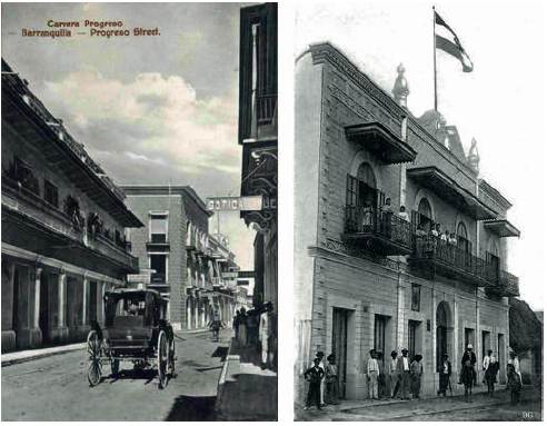 Transversal a estos paisajes arquitectónicos, se desplegaba la vida programática de la ciudad. En el callejón del Progreso hacia finales del siglo XIX la sociedad barranquillera comenzaba a tomar forma a partir de diversas expresiones modernas. A saber, el primer club, el Círculo del Comercio (Grau, 1896), antepasado directo del Club Barranquilla, "el Fraternidad" se comienza a reunir en las inmediaciones de San Nicolás, el primer teatro de la ciudad aparece en el cruce del callejón del Progreso con la calle de San Blas; las imprentas y librerías hacen presencia en la calle, de particular importancia la librería Diez en los bajos del Hotel Colombia. El primer ensayo de gran superficie comercial, el almacén Helda (Solano y Conde, 1993), aparece de forma temprana desde finales de la década de 1860. Progreso era también el sitio en donde confluían varios de los elementos modernizadores de la ciudad finisecular, a entenderse, el acueducto, ubicado en el Puerto Real; la Compañía Colombo-Antillana de Teléfonos, que aparece en 1878 en el cruce del callejón y la calle del Comercio y la línea central del tranvía de Barranquilla. Adyacen tes a la calle se encontraban los dos principales elementos de ornato de la ciudad: el parque de San Nicolás, construido entre 1885 y 1888, y el camellón Abello cons-truído en 1886 (Grau, 1896). Con el cambio de siglo, el callejón del Progreso era el armazón sobre el cual se moldeaba el ideario moderno de Barranquilla.