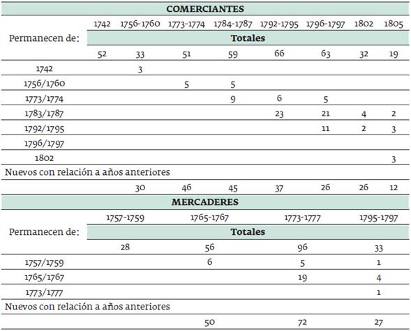 Los comerciantes, en su mayoría españoles, están señalados en el periodo 1742/1805, y los años 1757/1797 figuran los mercaderes, y de estos solo 4 fueron regidores. Advertimos que en la medida en que los intervalos de tiempos registrados (por ejemplo, 1792/1795 y 1796/1797 son años continuos) no son uniformes las cantidades de nuevos comerciantes se reducen.