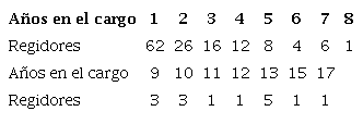 Esa renuencia para ocupar las regidurías y la consiguiente interinidad se observa en los listados de cabildantes que hemos elaborado para 43 años del tiempo comprendido entre 1749 y 1810. Los listados corresponden al 70,5 % del total de aquel periodo durante el cual 147 nombres (ver cuadro 1), entre nuevos y los que se repiten, aparecen en los listados de regidores que hemos reconstruido. De esa cifra, el 82 % ocupó regidurías entre 1 y 5 años (el 40% del total corresponde a quienes ejercieron el cargo solo por 1 año); el 11,8 % entre 6 y 10 años, y el 6,2 % entre 11 y 17 años. El predominio de quienes solo estuvieron en las regidurías entre 1 y 5 años indica que en su mayoría fueron regidores "añales", y expresa cierto nivel de dificultades para una institución cuyo funcionamiento fue rediseñado de manera que funcionara con base en los regidores perpetuos que compraban sus cargos.