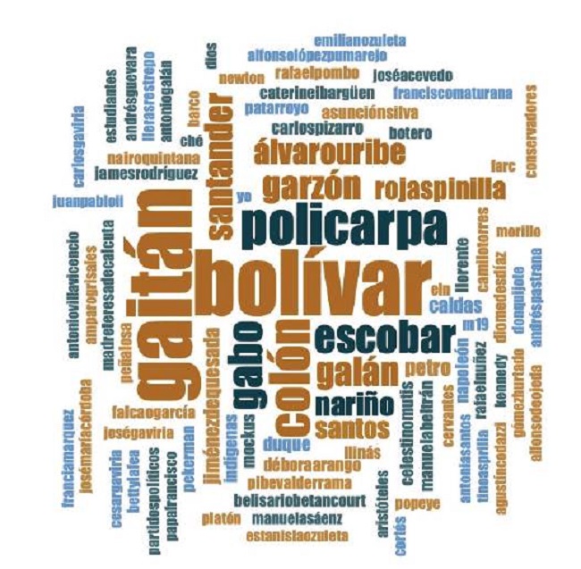 Es importante tener en cuenta que el instrumento final en el que aparece esta pregunta abierta está integrado por 24 interrogantes más -cerrados- con un total de 180 ítems, los cuales tenían que ser valorados por los estudiantes a través de una escala Likert. Aunque la información obtenida a través de estas preguntas -organizadas en núcleos de indagación: Epistemología de la Historia; 2. Cultura escolar/Cultura histórica; 3. Contenidos sustantivos; 4. Conciencia histórica; 5. Solución de problemas históricos- no se retoma directamente en este texto debido a su volumen, permitió dar sentido a los datos recolectados en torno a las figuras históricas mencionados por el estudiantado que participó en la investigación.