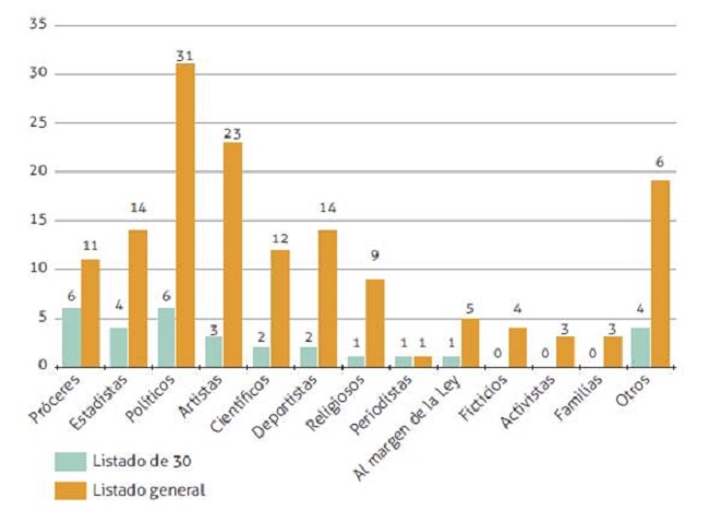 Al revisar las características de las agencias -tipo de acción histórica- de las treinta personas mencionadas11 con los IR más altos, surgieron once categorías que permitieron clasificarlas: próceres (N=6); estadistas (N=5); políticos (N=6); artistas (N=1); escritores (N=2); científicos (N=2); deportistas (N=2); religiosos (N=1); periodistas (N=1); al margen de la Ley (N=1), y otros (2). Por medio de estos referentes se agruparon los 119 personajes restantes que conformaban la lista definitiva de 149 (figura 3).