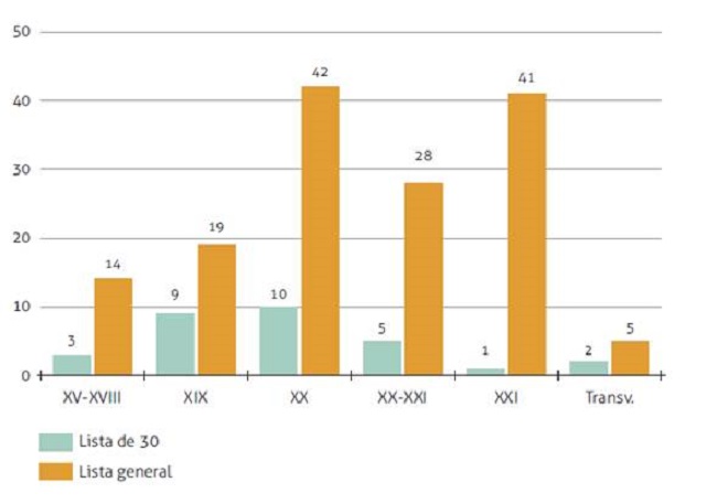El mayor porcentaje de las agencias históricas registradas en el listado general de personajes se ubica en el siglo XX con un 28,2 % (N=42). Este indicador para el mismo siglo aumenta en el caso de la selección de las personas con un IR significativo -listado de treinta-, ubicándose en el 33,3 % (N=io). Algo diferente ocurre para el siglo XXI, el cual, a pesar de concentrar el segundo mayor porcentaje de referencias totales con un 27, 5 % (N=4i), registra un descenso vertiginoso en los treinta primeros personajes, siendo tan solo del 3,3 % (N=i), la menor cifra de los seis ejes temporales. En dicho listado de treinta, la distribución porcentual de registros se ve reflejada de la siguiente forma: siglos XV al XVIII, 10 % (N=3); siglo XIX, 30 % (N=9); siglos XX al XXI, 16,7 % (N=5), y; Transversales, 6,7 % (N=2).