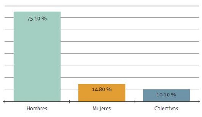 Existe una diferencia significativa en la distribución porcentual de los personajes según su sexo. De los 149 registros totales, el 75,1 % corresponde a hombres (N=ii2), el 14,8 % a mujeres (N=22) y el 10,1 % restante a referencias colectivas (N=15) (figura 5); distancia que se ahonda aún más si se tiene en cuenta que solo tres mujeres aparecen en los primeros treinta registros y dos de ellas se ubican en el puesto 25 -Manuela Beltrán, revolucionaria comunera (IR=24)- y 28 -Débora Arango, pintora (IR=17)-, respectivamente (tabla 4). Además, si se tiene en cuenta la frecuencia de mención de registros de mujeres en el listado total, se encuentra que más de la mitad (N=13) solo alcanza un indicador de uno (f=i), ubicado por lo general en las casillas con menor valor de relevancia -casillas cuatro y cinco-. No obstante, en medio de esta situación adversa, es importante destacar el lugar que ocupa Policarpa Salavarrieta en el listado, situándose en la casilla número cuatro con un IR (752) muy superior al de próceres de la independencia masculinos como Santander (IR=400), Nariño (IR=298) o Francisco José de Caldas (IR=8i) y figuras de la historia reciente del país como Gabriel García Márquez (IR=465), Luis Carlos Galán (IR=4i5) o Jaime Garzón (IR=362), que han tenido y tienen en la actualidad un mayor despliegue mediático en torno a su agencia.