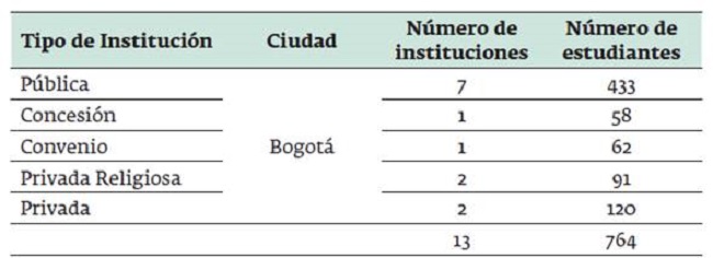 Los participantes en el estudio fueron 764 estudiantes de educación media que en 2019 estaban cursando el grado once en instituciones educativas públicas y privadas en la ciudad de Bogotá (tabla 1)5. Las edades de los participantes se encuentran en el rango de los 15 a 17 años. Con el fin de asegurar la representatividad de la muestra -99 % de confianza y 5 % de error-, al momento de la aplicación del instrumento se tomó como referencia de cálculo, el total de la matrícula del último grado de educación obligatoria -grado once-, registrado oficialmente por el DANE (Departamento Administrativo Nacional de Estadística); cifra que se ubicaba en 85 861 estudiantes6.
