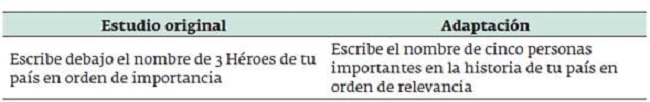 En cuanto al procedimiento seguido, los datos se recopilaron en horario escolar de los alumnos, a través de respuestas escritas a una pregunta abierta en torno a qué personajes históricos consideraban relevantes para la historia de su país7. La versión original del interrogante hace parte de un cuestionario empleado en estudios desarrollados en el Mercosur, orientados a entender y analizar el aprendizaje histórico y conciencia histórica de jóvenes en edad escolar (Amézola y Cerri, 2018; Cerri, 2018). Dicho instrumento, luego de pasar por un filtro inicial de selección de preguntas realizado por los autores de este artículo, fue adaptado mediante un proceso de evaluación de validez de contenido y fiabilidad. Este ejercicio se realizó a través de un juicio de expertos (Escobar y Cuervo, 2008; Hernández-Pina y Maquilón, 2010) y un estudio piloto en el que participaron 110 estudiantes con las mismas características de los participantes del estudio final -edad, ciudad de residencia y grado escolar en curso-. Como resultado del proceso de validación, en el caso específico de la pregunta sujeta a análisis, se estableció una modificación en la redacción del interrogante original, con el fin de evitar sesgos -la noción de héroe-8 que alteraran la recolección de información (tabla 2).