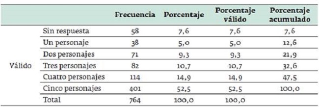 Un primer dato importante para tener en cuenta, en tanto marco general para desarrollar los ejes de referencia analítica propuestos, es el grado de capacidad de evocación de los estudiantes ante la pregunta planteada. De 3820 posibilidades de mención se obtuvo un total de 2887 (75,5 %), lo que significa que 933 espacios de respuesta quedaron en blanco. Estos espacios obedecen a las dificultades que tuvieron 363 estudiantes -47,5 %- para completar el ejercicio, en contraste con los 401 estudiantes -52,5 %- que mencionaron la totalidad de personajes solicitados (tabla 3).