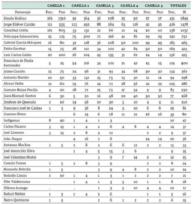 Por esta razón, para efectos del análisis propuesto -centrado en la noción de relevancia histórica-, se determinó trabajar con los primeros treinta registros colectivos e individuales de la tabla de clasificación que resultó del ejercicio metodológico de valoración de la relevancia propuesto por los investigadores -solo en situaciones concretas de comparación se hace alusión al listado general-. De las figuras que conforman este listado (tabla 4) se destacan dos: Simón Bolívar -héroe principal del panteón político oficial- que es mencionado por el 56,4 % del total de los estudiantes de la muestra (N=431), y Jorge Eliécer Gaitán -político clave en la historia del siglo XX colombiano-, personaje que fue registrado por el 55,7 % de los participantes en el estudio (N=426). Su frecuencia de mención y su índice de relevancia (IR) establecen diferencias significativas con los demás personajes de la lista, cuyas distancias entre sí, por el contrario, se van reduciendo gradualmente.