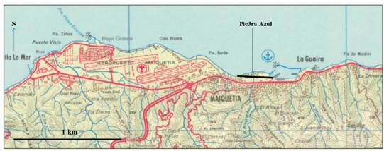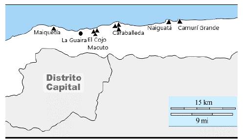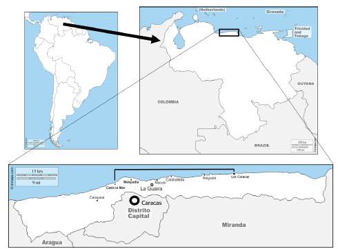 Lo que se denomina "Litoral Central de Venezuela" constituye una zona ubicada al norte del país, de cara al mar Caribe, constreñida por una larga y abrupta cadena montañosa, la cordillera de la Costa, cuyas elevaciones alcanzan los 2600 m. Se despliega sobre una franja territorial muy angosta, flanqueada por esas montañas y el mar. La región corre entre cabo Blanco y Chuspa, los puntos que la delimitan al oeste y al este, respectivamente. La zona a la que hemos prestado atención en este trabajo contiene al espacio mayormente habitado y desarrollado de ese territorio. Se trata de unos 100 km, aproximadamente, que van desde Los Caracas hasta Catia la Mar, hoy interconectado por una vialidad construida a mediados del siglo XX, todo ello inconexo anteriormente (ver Imagen 1). En esta zona de reciente desarrollo urbano, el ámbito más amplio para el asentamiento supone apenas unos 3 km de ancho. Todo tiene lugar en ese breve espacio, condensando allí la idea de región balnearia que despuntó desde finales del siglo XIX.