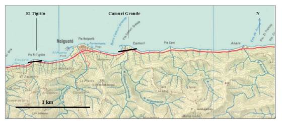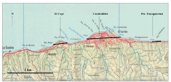 Se elaboraron los perfiles topográficos de esos seis abanicos fluviales mencionados, y para ello se utilizaron mapas topográficos a escala 1:5.000 con curvas de nivel cada cinco metros (Dirección de Cartografía Nacional, 1959; Gobernación del Distrito Federal, 1984). Los perfiles tienen una orientación general este-oeste atravesando los abanicos en forma perpendicular al cauce. Todos los perfiles comienzan y terminan en la cota de 0 m s.n.m. Su ubicación puede verse en las imágenes 10a-c y corresponden a los cauces de Piedra Azul, El Cojo, Caraballeda, Punta Tanaguarena, El Tigrillo y Camurí Grande.