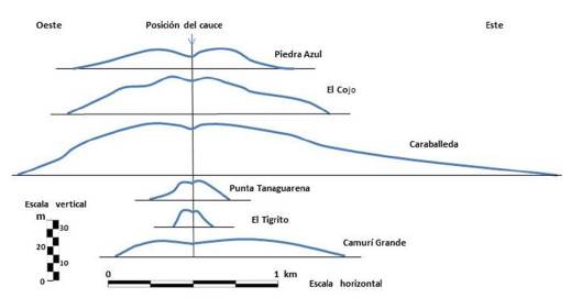 La Imagen 11 muestran los perfiles elaborados para este trabajo desde la perspectiva baja-oblicua indicada, y en todos ellos se observa un gradual ascenso para llegar a la posición actual del cauce, el cual siempre presenta un entallamiento de su propio abanico. El perfil más extenso de los presentados es el de Caraballeda, y el que presenta mayor pendiente en los lados es el de El Cojo.