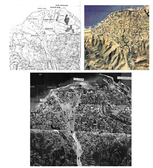 En otros casos, como en Los Corales o Punta de Mulatos, el paso de la vialidad llevó la topografía a una cota plana, casi a nivel del mar, en beneficio de la circulación automotriz, eliminando las elevaciones o lomos de camello. Otros casos exponen desarrollos formales o autoconstruidos que se plegaron linealmente a la topografía, o bien conviven con los grandes bloques depositados en las márgenes de los abanicos; este es el caso de Caraballeda, sobre altas terrazas ya abandonadas por el río San Julián, o El Teleférico y Las Quince Letras, adosados a las terrazas de la quebrada de El Cojo (ver imágenes 12 y 13).