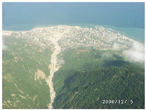El evento de 1999 se caracterizó por una descarga de lluvias intensas de hasta 36 horas continuas entre el 15 y el 17 de diciembre. Durante todo ese año, además, se registraron precipitaciones por encima de los promedios anuales obtenidos entre 1891 y 1998 (Stockhausen et al., 2001). La mayor descarga de estas lluvias ocurrió, precisamente, en diciembre, cuando se acumularon hasta 1200 mm/m2 y un registro de 2200 mm/m2 en algunas cuencas ubicadas en la parte alta de la cordillera de la Costa (López, Hernández, García Martínez y Shucheng, 2000). El volumen de agua que cayó sobre estas laderas produjo derrumbes que fueron a dar al fondo de los cauces, conduciendo este material en forma de flujos torrenciales a lo largo de todos los ríos y quebradas de la región, unos cincuenta y tres, aproximadamente. Once de estos cauces se ubican en la zona de mayor desarrollo urbano, sobre las jurisdicciones de Naiguatá, Caraballeda y La Guaira, donde se produjeron los daños más contundentes (imagen 2). Se estimaron unos 8 millones de metros cúbicos de material arrastrado por estos flujos hasta los abanicos ubicados en la zona baja (Herrera et al., 2000).