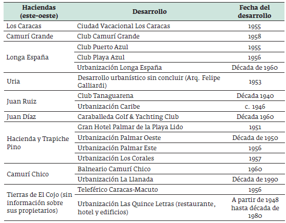 Otros clubes le darán al este del litoral ese impulso decisivo hacia el urbanismo que consolida a la región como balneario moderno: el Club Puerto Azul (iniciado en 1955, inaugurado en 1962); el Club Playa Azul (diseñado en 1956 y desarrollado en la década de 1960); y el Club Camurí Grande (creado en 1958, desarrollado en años siguientes). Acompañan a estas inversiones otros desarrollos con igual sentido: el Gran Hotel Palmar de la Playa Lido y su playa privada (c. 1951); la Ciudad Vacacional de Los Caracas (1955), desarrollada por el Estado; las urbanizaciones Palmar Este y Los Corales (desarrolladas entre 1956 y 1957), con diseños del arquitecto venezolano Carlos Raúl Villanueva (el mismo que diseñó y desarrolló la Ciudad Universitaria, Universidad Central de Venezuela, en Caracas, declarada Patrimonio de la Humanidad por la Unesco en el año 2000); y los grandes hoteles del este (Guaicamacuto, construido entre 1953 y 1955, luego Sheraton, desde 1963; Meliá, abierto en 1975). A todo eso hay que sumar la construcción de edificios cuyo destino fue el de segundas viviendas o apartamentos de balneario, lo que sucedió, casi explosivamente, entre las décadas de 1960 y 1970, con desarrollos por el estilo todavía entre 1980 y 1990. La relación entre las antiguas haciendas y el desarrollo urbano es elocuente y representa, asimismo, la transformación de la antigua riqueza habida en tiempos coloniales, en capital de utilidad moderna. Es un trasvase histórico del uso del espacio y del capital (tabla 1).