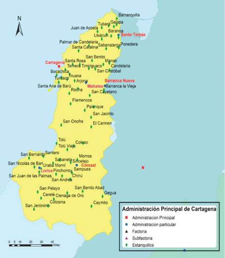 La fábrica formó parte del engranaje de la Real Renta de Tabacos, establecida en esta ciudad en 1776, la que a su vez dependía de la Dirección General de Tabacos de Nueva Granada, radicada en Santa Fe de Bogotá. Tras la reorganización del ramo de tabacos efectuada por el regente Juan Antonio Gutiérrez de Piñeres entre 1778 y 1779, Cartagena fue elevada a la condición de administración principal, una de las siete en las que se dividió administrativa y jurisdiccionalmente el virreinato. Su competencia territorial abarcó el espacio comprendido entre los ríos Magdalena, Sinú y San Jorge hasta los límites con la provincia de Antioquia, y las costas del mar Caribe, territorio que se subdividió en seis administraciones particulares o estancos y más de cincuenta estanquillos que llevaron al público los cigarros de la real fábrica y el tabaco en manojos cultivado en el distrito tabacalero de Ambalema (mapa 1)5.