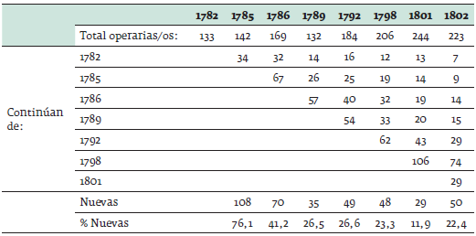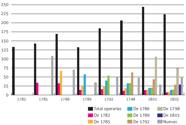El trabajo estaba organizado en cuadrillas, dirigidas por un cabo, especie de capataz salida entre las trabajadoras, que al tiempo que también laboraba controlaba a las demás operarias, mantenía la disciplina, la concentración en la productividad y velaba por la calidad de los trabajos realizados. La cantidad de cuadrillas y de sus integrantes dependió de las instalaciones de los inmuebles donde laboraban, pues al no ser espacios diseñados y construidos para funcionamiento de la fábrica, las dimensiones de habitaciones, salas, corredores y patios determinaron el número de aquellas. En algunas ocasiones estas unidades de trabajo oscilaban entre 10 y 25 operarias36. La fábrica empezó labores con 8 cuadrillas. Para inicios del decenio de 1780 ascendían a 937, y a mediados de esos años eran 10. La compra en 1798 de la casa contigua a la que se utilizó como instalación inicial de la fábrica explica que el número de cuadrillas haya pasado de 10 a 12 para luego estabilizarse en 11. En sus comienzos las cuadrillas eran dirigidas por hombres y hubo una integrada en su totalidad por varones (97 mujeres y 27 hombres en 1782; 6 cabos hombres y 3 cabos mujeres)38. Pero paulatinamente las mujeres más emprendedoras y con mayores capacidades productivas empezaron a ocupar las plazas de cabos. Durante el tránsito entre los decenios de 1780 y 1790 los hombres no aparecen en funciones de cabos de cuadrillas, y desde 1792 desaparece de los pocos registros que quedaban la cuadrilla que estaba integrada por estos. En consecuencia, las mujeres pasaron a formar la totalidad de la mano de obra. En términos generales, el promedio de trabajadoras estuvo entre 190 y 200 operarias (ver cuadro 4 y gráfico 1), variaciones que dependían de la demanda y de existencia de insumos. En la fábrica se estabilizó una importante franja de trabajadoras, como puede observarse en el cuadro 4, que registra la renovación y permanencia de las trabajadoras en sus ocupaciones. Asimismo, en los porcentajes se ve una tendencia decreciente de las trabajadoras nuevas.