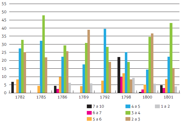 Los jornales variaban de acuerdo a la existencia de materias primas, la demanda y de si las rutas de tráfico marítimo estaban exentas de los conflictos con otros imperios. Según los informes parciales del administrador de la fábrica, en 1798 el promedio de la producción diaria fue de 2 libras (256 cigarros). El ejercicio que hemos realizado en el cuadro 5 y los gráficos anexos muestra que en 1782, 1785 y 1786 el 60, 69 y 80 % de los jornales se concentraron entre los 3 y los 5 reales. En 1798 y 1800 las mayores cantidades de jornales (el 60 y el 69 %) estuvieron en el rango de 2 a 4 reales. Las variaciones en los jornales devengados por las trabajadoras guardaron una relación directa con los tiempos de paz y de guerras entre España y otros imperios. Los conflictos bélicos de 1778-1783, 1792-1796-1802 y 1804-1808 afectaron el aprovisionamiento de materias primas provenientes de Cuba, lo que a su vez incidía en la producción de las trabajadoras. El cuadro 5 y el gráfico 3 registran las diferencias salariales entre las trabajadoras con base en una muestra aleatoria correspondientes a 4 semanas de distintos años, consignando el total de trabajadoras, una escala ordinal de jornales y las cantidades de operarias que los ganaban acorde con la producción que realizaban. Los jornales devengados muestran las diferentes capacidades productivas de las trabajadoras. Al promediar las diversas cantidades de trabajadoras que devengaban los distintos jornales se constata que las mayores concentraciones estaban en el orden de 3 a 4 reales por día, seguidas por las que ganaban entre 4 y 5 reales. Solo en 1798 y 1800 fue mayor el número de trabajadoras comprendidas en la escala salarial entre 2 y 3 reales por día, la que en el resto de los años tabulados siempre había estado en el tercer lugar.