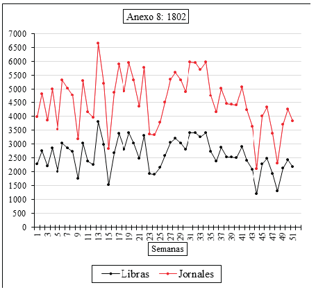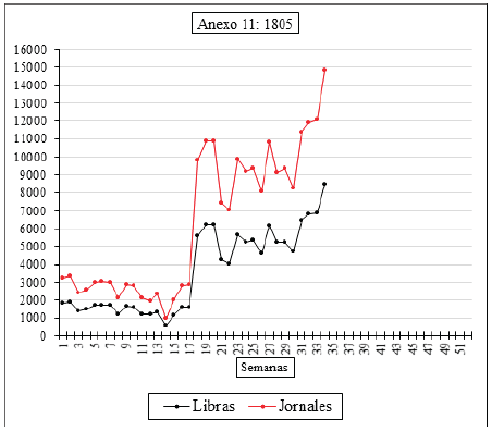 Los jornales de las trabajadoras dependían de la producción individual medida en libra de cigarros (128 unidades en total)43. Entre 1779 y mediados de 1782 las trabajadoras recibieron un cuartillo por libra labrada, bajo reconocimiento salarial que pudo originar dificultades para contar con mano de obra. Luego, teniendo en cuenta que Cartagena era una ciudad con alto costo de vida (Solano, 2018, pp. 549-588) se les pagó la libra a 1,3 reales, valor que se mantuvo hasta 180544. Tanto el aumento de lo pagado por libra procesada como el incremento del número de trabajadoras se reflejan en los gráficos anexos que representan los montos semanales de los jornales. En 1782 (anexo 1) el monto de los jornales semanales estuvo entre 1500 y 2500 reales. Luego (anexos 2 a 10) estuvieron entre los 2500 o 3000 hasta los 5000 reales. La producción individual dependía de las habilidades de las trabajadoras y de los mecanismos de control establecido por los administradores para comprometerlas con un mayor rendimiento cuando había provisión generosa de materias primas. Y los anexos representan las relaciones semanales entre libras de cigarros producidas y los montos totales de los jornales ganados. La información analizada muestra que en términos generales la productividad semanal total se mantuvo entre 2000 y 3000 libras de cigarros por semana, para un promedio mensual de 11 000 reales distribuidos entre las operarias45.