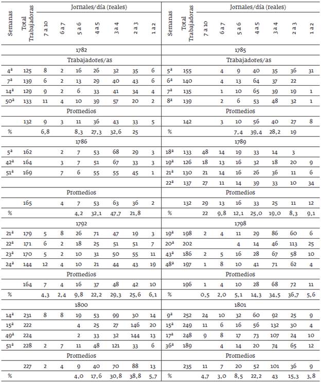 Los salarios representaron una alta cuota de las erogaciones de la fábrica. Informes parciales indican que entre 1779 y 1785, y en los años de 1792, 1796, 1798 y 1799, 1800, 1802 a 1805 casi el 40 % de sus gastos se destinaba al pago de los jornales (ver cuadro 3 y gráficos anexos); alto porcentaje propio de los establecimientos manufactureros en los que, por una parte, la baja tecnología empleada implicaba un predominio del capital variable, y el trabajo a destajo podía estimular a las operarias a intensificar la producción para devengar mayores jornales41.
