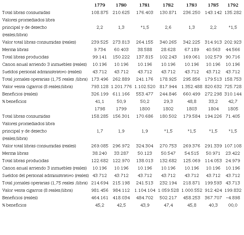 Para tener una idea sobre la rentabilidad de la fábrica, en el cuadro 3 relacionamos el peso total del tabaco que enviaba los almacenes de la administración principal a la fábrica, la disminución del peso por efectos de la merma (desnervar las hojas y quitar las partes dañadas), el valor en bruto del total de ese tabaco promediado a 1,5 reales la libra, el total de las libras de cigarros producidas, los gastos en arriendos de las instalaciones y el pago de la mano de obra mediante la multiplicación de las libras de cigarros producidas y el valor reconocido de 1,75 reales por libra elaborada, el producido por la venta de las libras de cigarros elaboradas (8 reales la libra) y las diferencias entre los ingresos y los egresos. Asimismo, la tabla contiene los montos de los ingresos totales por efecto de la venta de los cigarros, calculados con base en el precio de 8 reales la libra, el que se mantuvo estable durante los años del periodo que comprende. Y la última fila contiene el saldo que quedaba de restar los egresos (compra de tabaco y pago de mano de obra) y los ingresos (venta de cigarros).