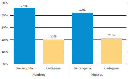 La participación registra una distribución más homogénea en cada ciudad cuando se considera el sexo. En Cartagena la asistencia a las fiestas es levemente superior en las mujeres (21 % versus 20 %), mientras que en Barranquilla los hombres registran una participación promedio mayor (46 % frente a 42 %) ( gráfico 3). Lo observado en Cartagena sigue más de cerca la evidencia colombiana, según la cual no existen razones para esperar una diferencia en la participación cultural de hombres y mujeres ( Espinosa y Palma, 2019). Sin embargo, según el contexto y tipo de actividad, puede hallarse que las mujeres presenten tasas de participación mayores que se asocian a las diferentes formas de socialización en la niñez: las niñas a través de actividades culturales y los niños con actividades deportivas ( Mauri & Wolf, 2020; Espinosa, Palma, Heredia y Rodríguez, 2018; Christin, 2012).