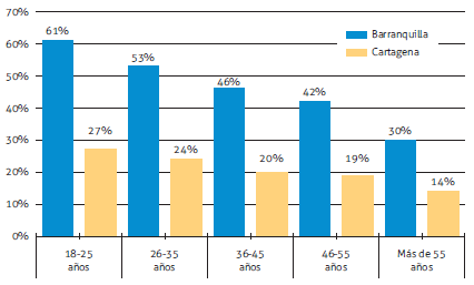 A través de la edad se puede analizar la manera como se condiciona el 'gusto cultivado o adquirido' en la participación cultural. En ambas ciudades se observa una caída constante en la participación a medida que aumenta el rango de edad. Este descenso es mayor en Barranquilla si se comparan las tasas de participación de los más jóvenes (18-25 años) y de los más adultos (mayores de 55 años).