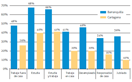 Justamente, según el uso del tiempo disponible en actividades de ocio, quienes estudian, estudian y trabajan al tiempo, y trabajan por fuera de la casa, presentan las mayores tasas de participación en ambas ciudades ( gráfico 5). Esto puede deberse a un doble efecto positivo: el primero, en ambas ciudades se cuenta con un grueso grupo de participantes vinculados a temprana edad en actividades festivas por cuenta del gusto cultivado, y el segundo, a la existencia de un perfil de ingresos y de disponibilidad de recursos más elevado asociado al trabajo.