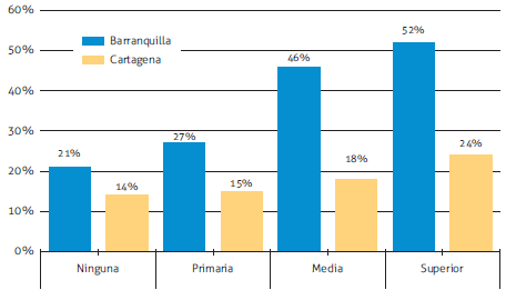 En términos generales, se observa que esta tesis se cumple principalmente entre los asistentes al carnaval, esto es, que la participación en actividades festivas aumenta con el nivel educativo ( gráfico 6). Como ocurre hasta el momento, las brechas de participación relativas a la educación son más notorias en Barranquilla. De hecho, en esta ciudad, una persona sin educación ha logrado participar en los 10 años un tercio más de lo que logra una persona con características similares en Cartagena. Esta distancia aumenta entre la población con mayor escolaridad: las brechas logran ser más del doble (52 % en Barranquilla versus 24 % en Cartagena) ( gráfico 6).