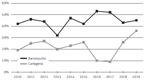 La participación en el Carnaval de Barranquilla y las Fiestas de Independencia muestra brechas significativas durante el periodo de estudio. La participación en el carnaval es sustancialmente mayor, aunque en los últimos años se ha presentado una recuperación significativa de la participación en las festividades cartageneras ( gráfico 1). A pesar de este repunte, la participación en el carnaval durante los 10 años es más del doble que la reportada en las fiestas de Cartagena ( gráfico 2).