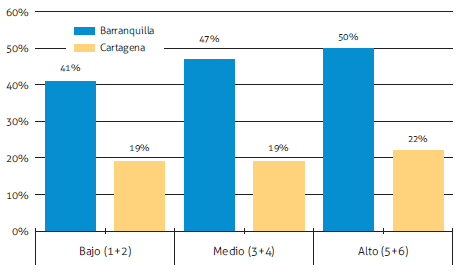 No obstante, el carácter popular y descentralizado de algunas de actividades que se desarrollan en estas festividades, como los bailes, verbenas y reuniones en el barrio, cuyas celebraciones se comportan como bienes públicos, podrían acortar las brechas de participación. Esta consideración parece observarse en los resultados: Cartagena presenta una participación similar entre los distintos estratos de la población; mientras en Barranquilla la participación en el carnaval muestra un patrón más estratificado ( gráfico 8).