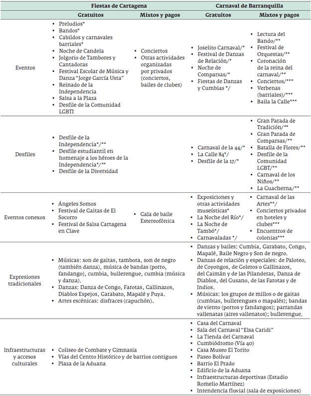 En su constitución y desarrollo, estas celebraciones también comparten un repertorio de manifestaciones de las distintas culturas y pueblos de América, Europa y África ( Abello et al., 2005). Además de exponer imaginarios, carnaval y festividades comportan hoy en día procesos de expresión, interpretación y creación que ocurren en el ámbito público (desfiles, conciertos, casetas, exposiciones, etc.) o privado (fiestas de clubes y reuniones), de manera activa (en comparsas, agrupaciones musicales, arte callejero) o pasiva (en calidad de espectadores), procesos que evidencian el tránsito de una memoria colectiva de tradición a una contemporánea ( tabla 1).