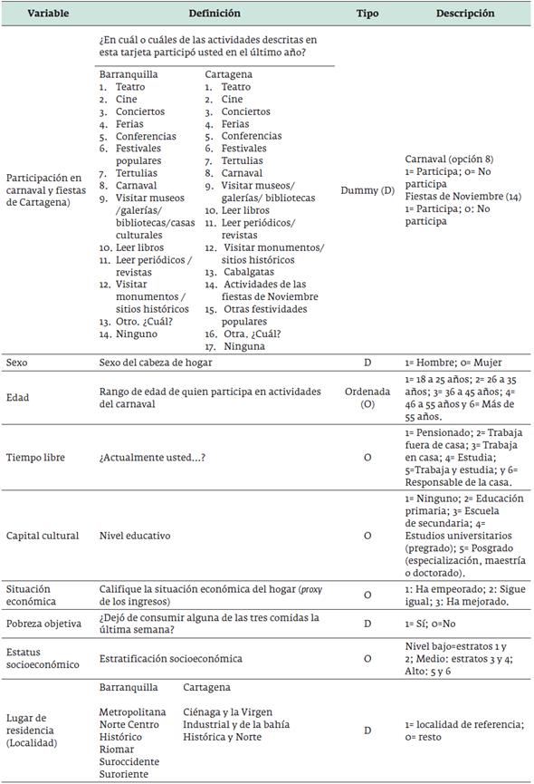 Las variables explicativas tradicionales son las que se han usado frecuentemente en la literatura teórica y empírica sobre los determinantes de la participación cultural. Según la literatura sobre economía de la cultura, estas son: el nivel educativo (asimilable al capital cultural), el ingreso y la disponibilidad de tiempo ( Ateca, 2007). Adicionalmente, se consideran factores estructurales que condicionan la valoración socioeconómica de participar en las festividades, las cuales se operacionalizan mediante variables del contexto de cada ciudad ( Aguado y Palma, 2015; Espinosa y Palma, 2019). Estas variables son el estatus socioeconómico -evaluado mediante la estratificación-, los tipos de pobreza (objetiva y subjetiva) y la localización en el territorio (localidades y residencia en zonas rurales para el caso de Cartagena).