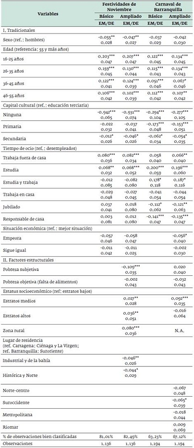 En general, ambos modelos muestran resultados esperados en cuanto al signo de los coeficientes estimados (efectos marginales) y la significancia estadística de la mayor parte de variables tradicionales de los modelos de demanda cultural: el capital cultural, el uso del tiempo de ocio, la edad, el sexo y en menor grado los ingresos, cuya variable proxy es la percepción de los hogares sobre la situación económica. Igualmente, son consistentes los estimadores de dos de los factores estructurales: la estratificación para ambas ciudades, y la localización de la población para el caso de Cartagena, que captura las brechas urbano-rurales en esta ciudad. Ambas celebraciones tienen en común que la edad y la educación influyen en la decisión de participar, en tanto que se aprecian diferencias explicativas que se relacionan con la situación económica, el sexo, el tiempo de ocio y las variables estructurales consideradas.